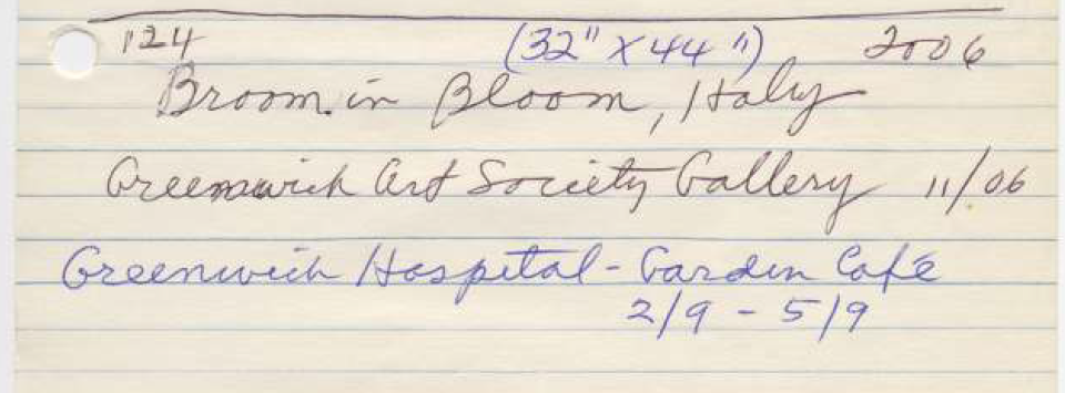 Inscribed in black marker, reverse, on canvas over top stretcher bar: [left of center] “BROOM IN BLOOM – ITALY” | [right of center] MARION RANYAK.