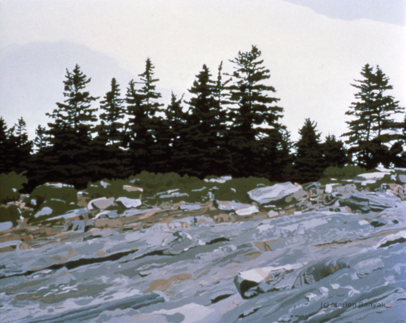 Inscribed in black marker, reverse, on canvas over top stretcher bar: [left of center] “TOWARDS THE SHORE” | [right of center] © MARION RANYAK 1983.