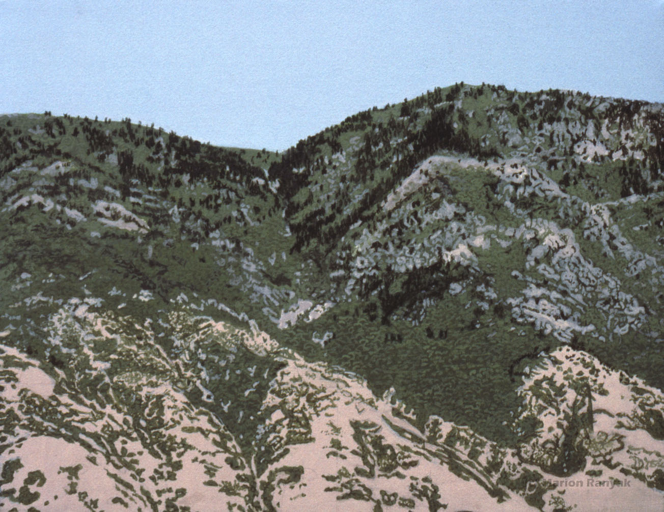 Inscribed in black marker, reverse, on canvas over top stretcher bar: [left of center] MARION RANYAK | [center] “PATTERNS OF TREES ON MOUNTAINS”.